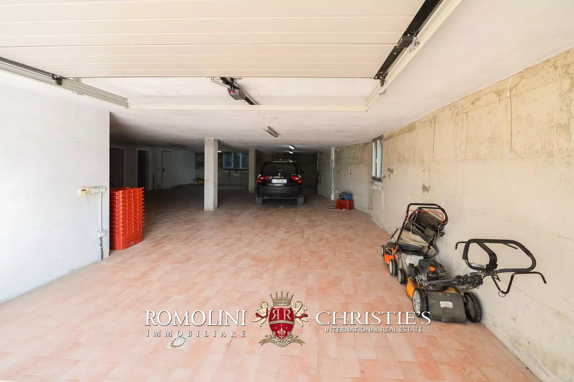 All’esterno troviamo un giardino di 3.500 m², interamente recintato e corredato da un piazzale pavimentato particolarmente utile come parcheggio per le auto. Tutto attorno alla proprietà si stende poi l’oliveto con 200 piante (circa 8.000 m²), già in produzione.